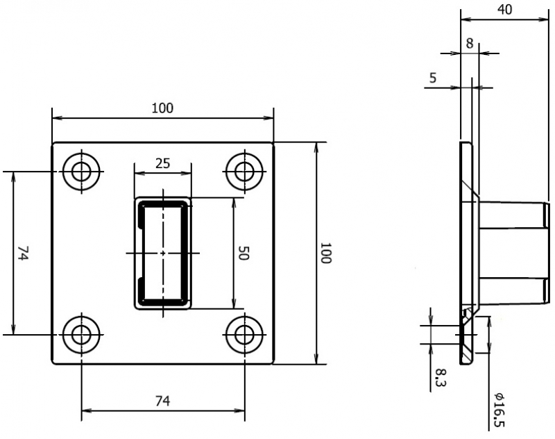316 Base plate for 25.4x50.8mm rectangle tube. Slotted or standard tube. Mirror
