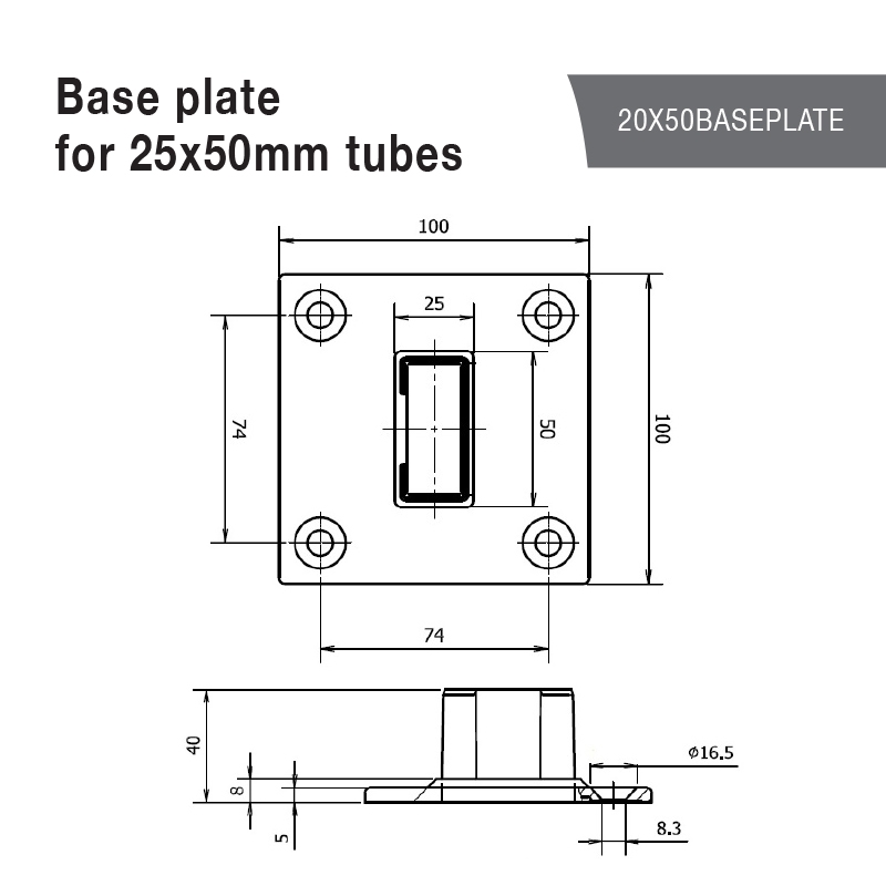 316 Base Plate For 25.4x50.8mm Rectangle Tube. Slotted Or Standard Tube. Mirror