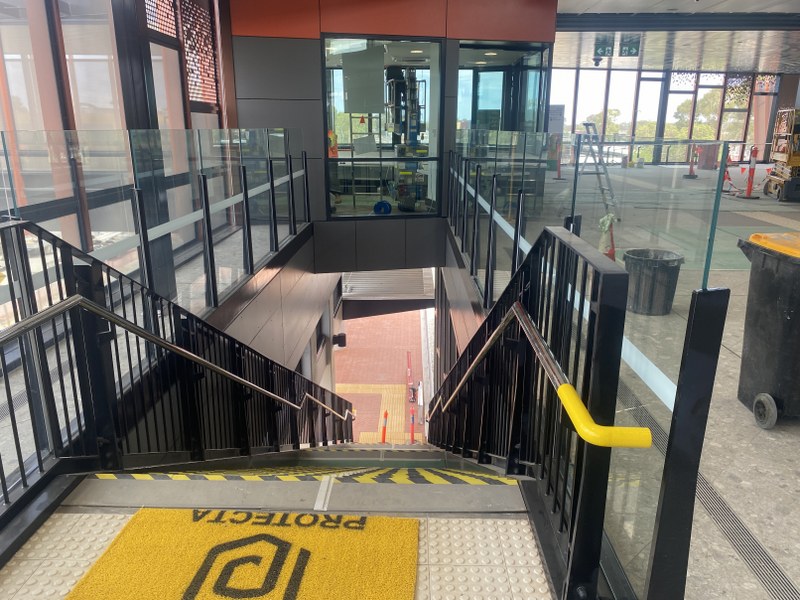 Metforce steel floor mounted handrail with round tube posts and optional kick rail, Perth